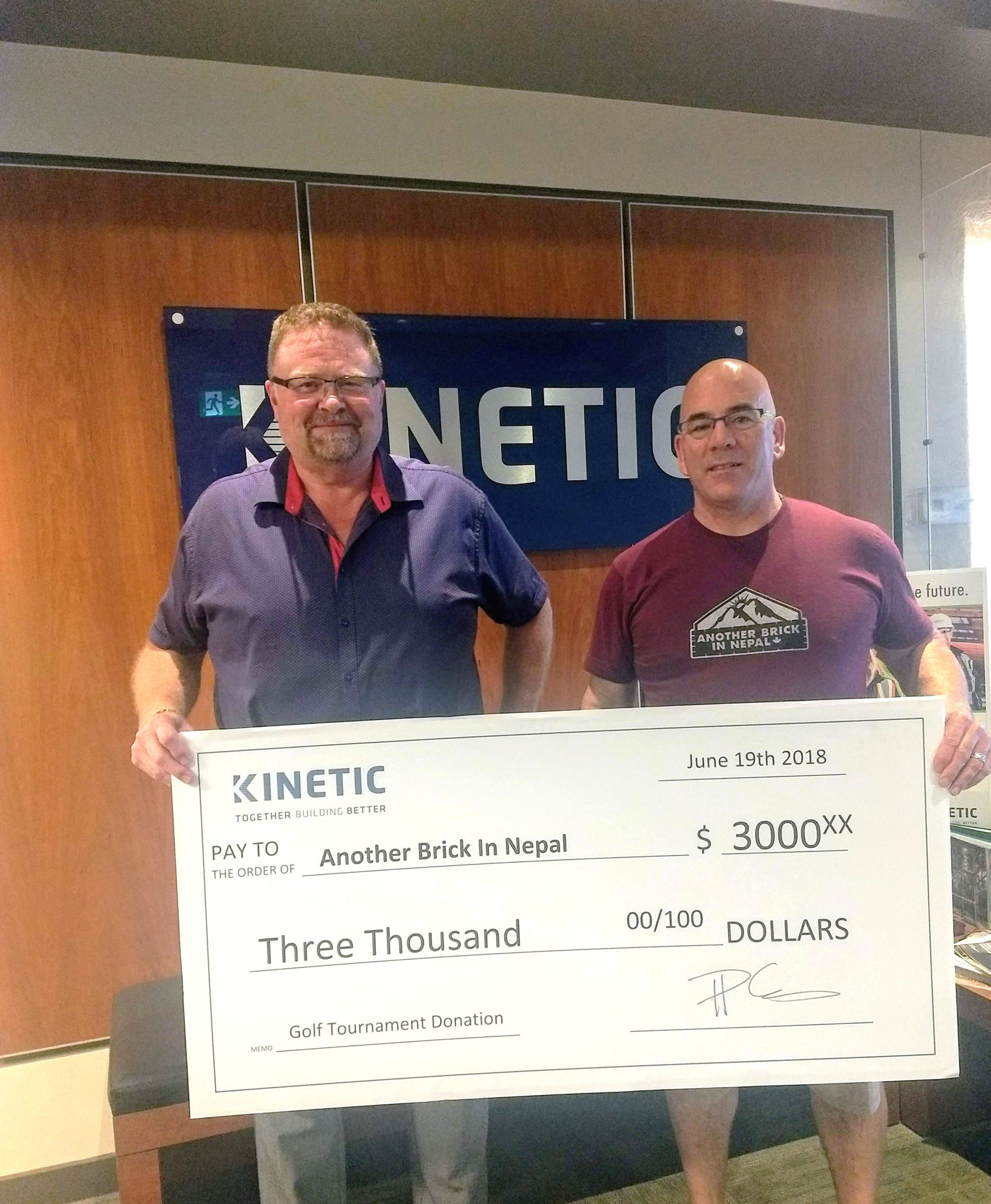 On June 19, 2018 Kinetic’s President & CEO, Tom Plumb, handed over a cheque for $3,000 to Rob Tournour on behalf of Another Brick in Nepal.